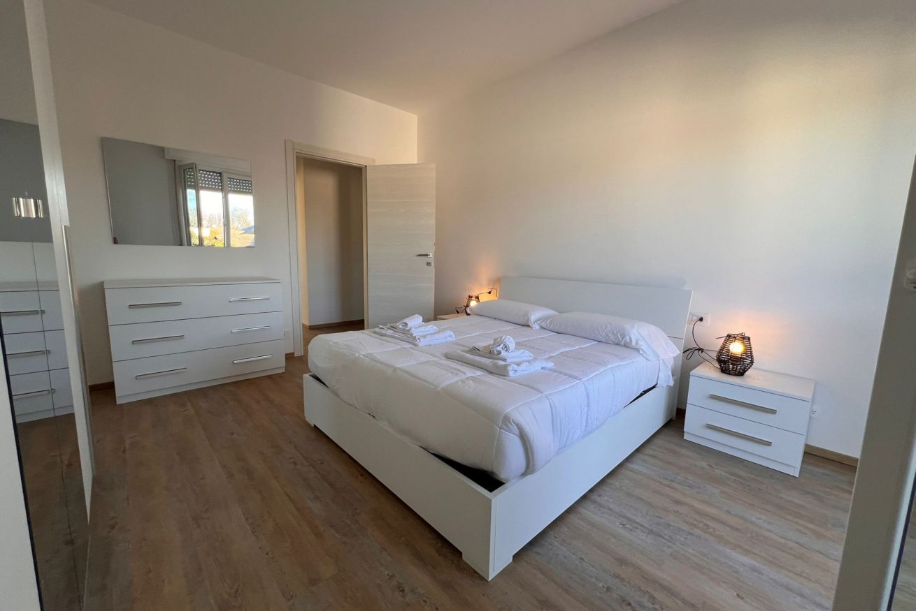 Gli spazi interni sono ampi e luminosi: due camere da letto accolgono gli ospiti, una con un confortevole letto matrimoniale e l’altra con due letti singoli, ideali per famiglie o gruppi di amici. In soggiorno, un comodo divano letto offre ulteriori posti per la notte, senza rinunciare a comfort e funzionalità.